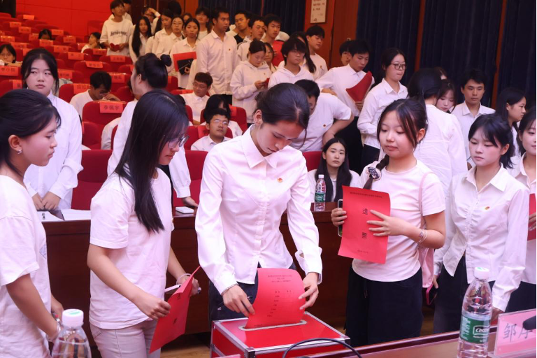会议第二阶段,与会代表审议并通过了学生会工作报告及章程修订案。经候选人竞选演讲、代表无记名投票,大会选举产生了由王智强、孙应美、王琳、王洪溶、朱镕乐五名同学组成的第七届学生会主席团。新当选的主席团成员在全体代表的见证下进行了庄严宣誓。